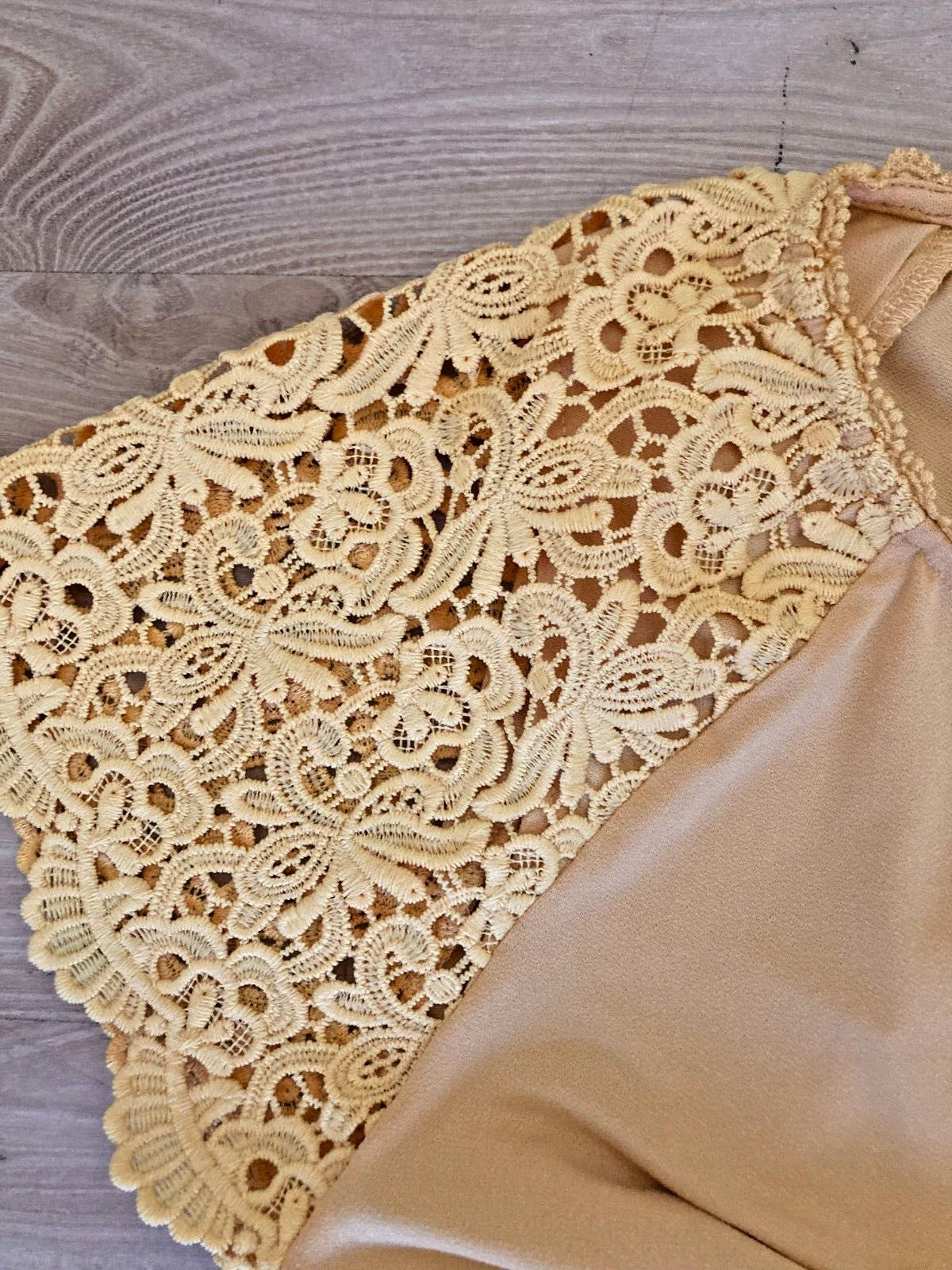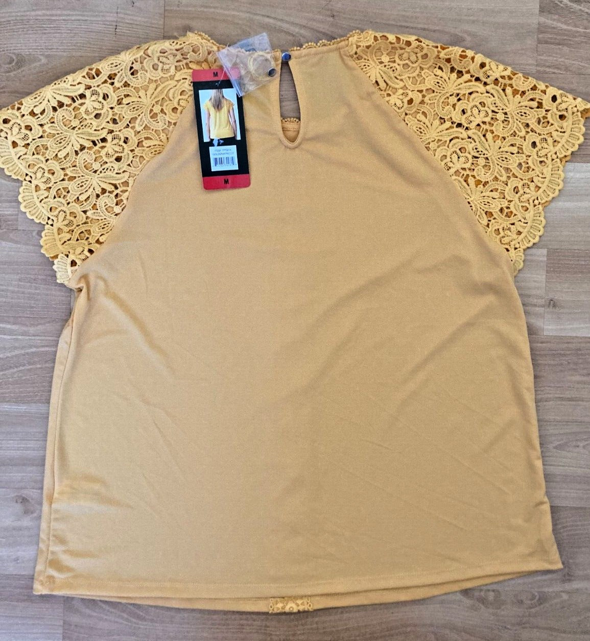 Luxurious Fabric: Crafted from a soft and lightweight crepe fabric blend of 95% Polyester and 5% Spandex for comfort and style.Feminine Details: Features delicate lace trim and flutter sleeves for an elegant and romantic look.Detailed lace trim panel on the front adds a touch of sophistication and visual interest.Versatile Style: The relaxed fit and flutter sleeves create a flattering and effortless silhouette.Vibrant Color: Available in a beautiful shades that adds a pop of color to any outfit.