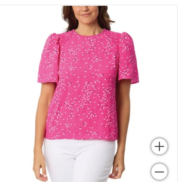 Crew neckline Textured Fabrication Smocked Shoulder Detail Keyhole Back Short sleeve Made in China